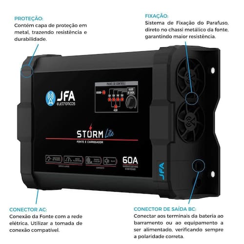 Fonte Automotiva Carregador de Bateria Storm Lite 60A JFA Bivolt Carro Som Automotivo Fonte Automotiva Carregador de Bateria Storm Lite 60A JFA Bivolt Carro Som Automotivo - 7898554808011 A Fonte e Carregador Storm Lite JFA é a melhor opção para alimentação do seu sistema de som, utilizando ou não baterias, com ótimo custo benefício. Seu diferencial é possuir a voltagem de até 15.2V, com a tensão para equalização dos vasos internos da bateria, única do mercado. Características:- Marca: JFA- Referência: 7898554808011Imagens Meramente Ilustrativas Especificações Técnicas:- Saída ajustável, 12V até 15,2V - tensão para equalização dos vasos internos da bateria;- Indicador de tensão, com voltagem de até 15.2V;- Smart cooler - sistema de ventilação inteligente;- Slim - design arrojado e compacto;- Entrada: 90 a 140Vac / 170 a 240Vac Bivolt Automático - Consumo com máxima carga: 900W- Corrente máxima de saída carga: 60 Amperes- Tensão de saída ajustável: 12 a 15.2vac- Smart Cooler: Controle dinâmico por PWM- Proteções: Excesso de carga / Curto na saída / Temperatura- Dimensões L x A x P mm : 259 x 151 x 58- Peso: 1,440kg- Potência máxima com bateria: 3.000W rms- Potência máxima sem bateria: 750W rms Conteúdo da embalagem:- 01x Fonte Automotiva Carregador de Bateria Storm Lite 60A JFA Bivolt Carro Som Automotivo - 7898554808011