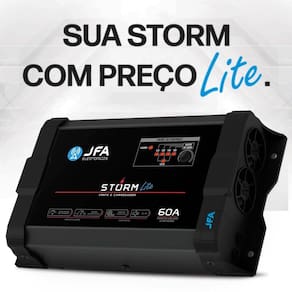 A Fonte e Carregador Storm Lite JFA é a melhor opção para alimentação do seu sistema de som, utilizando ou não baterias, com ótimo custo benefício. Seu diferencial é possuir a voltagem de até 15.2V, com a tensão para equalização dos vasos internos da bateria, única do mercado.