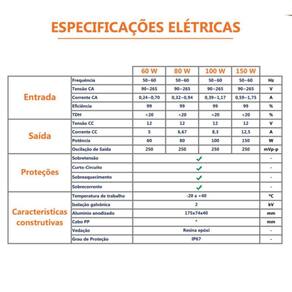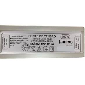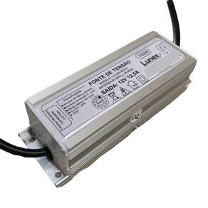 Fonte de Tensão 12V 12,5A -100W Fonte de tensão com alto desempenho e eficiência, para aplicação Principal em iluminação a LED Possui grande capacidade de estabilização e filtros eficientes que Garantem ótimo desempenho e segurança, através de tecnologia de ponta. Especificações: Potência Máxima 100W Tensão de saída 12V estabilizada Abas de fixação sim Medida 150 x 56 x 46mm Corrente de saída 12,5A Tensão de Alimentação 90 a 265 VAC Grau de Proteção IP 67 : 01 ano com o fabricante Marca: Não Informado
