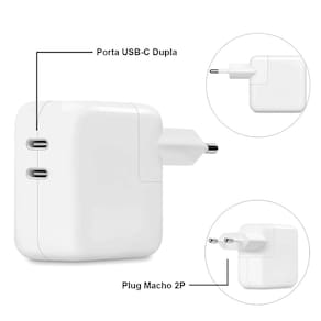 Características: • Porta dupla USB-C para carregar 2 dispositivos ao mesmo tempo; • Potência total: 35W; • Alta eficiência e estabilidade; • Design compacto e elegante na cor branca; • Material resistente e de longa durabilidade; • Plug 2P padrão brasileiro; • Ideal para celulares, tablets e outros dispositivos USB-C; • Carregamento rápido (dependendo da compatibilidade do aparelho).
