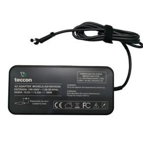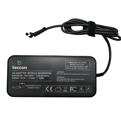 Informações Técnicas: Tensão (Voltagem): 19.5V Corrente (Amperagem): 9.23A Potência: 180W Dimensões do pino: 5.5mm x 2.5mm Comprimento do cabo de energia: 1,50m Condição: Novo Origem: Similar Garantia: 06 Meses Marca: Teccon