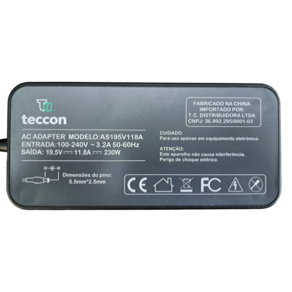 Informações Técnicas: Tensão (Voltagem): 19.5V Corrente (Amperagem): 11.8A Potência: 230W Dimensões do pino: 5.5mm x 2.5mm Comprimento do cabo de energia: 1,50m Condição: Novo Garantia: 06 Meses Marca: Teccon