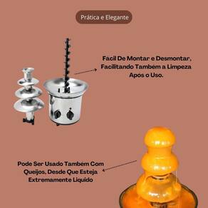 Características Principais: - Tensão: 127V / 60Hz - Potência: 170W - Capacidade: 1200ml - Material: A cascata é feita de aço inoxidável de alta qualidade, garantindo durabilidade e elegância. - Controle de Temperatura: Ajuste a temperatura conforme sua preferência para manter o chocolate sempre na consistência perfeita. - Modo de Usar: Simples e prático Basta colocar o chocolate derretido na base e ligar o motor. O chocolate é então impulsionado através da torre, criando uma irresistível cascata de chocolate.