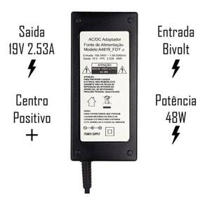 Especificações: - input: bivolt 110-240v - 1.0a 50/60hz - output: 19v - 2.53a positiva - watts: 48w - plug: 6.4mm x 4.4mm - comprimento do rabicho: 1,60 metros - cabo de força: tripolar mickey incluso - medidas da fonte: comprimento = 8,7 cm / largura = 4,8 cm / altura = 2,7 cm - cor: preto