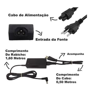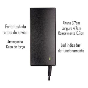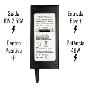 Especificações: - input: bivolt 110-240v - 1.0a 50/60hz - output: 19v - 2.53a positiva - watts: 48w - plug: 6.4mm x 4.4mm - comprimento do rabicho: 1,60 metros - cabo de força: tripolar mickey incluso - medidas da fonte: comprimento = 8,7 cm / largura = 4,8 cm / altura = 2,7 cm - cor: preto