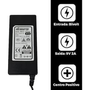 Quais as especificações do produto - input: bivolt 110 - 240v 50-60hz 0.33a - output: 9v - 2.0a positiva - plug: pino 1.7mm x 4.0mm - comprimento do rabicho: 1,20 metros com filtro - cabo de força: acompanha - medidas da fonte: comprimento = 8,7 cm / largura = 4,8 cm / altura = 2,7 cm - cor: preto - atente-se também ao pino conector, ele deve ser igual ao utilizado no seu aparelho comprimento e largura .