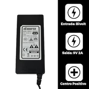 Fonte bivolt, com saida de 9v 2A. Acompanha Rabicho de entrada de Ac cabo Produto de excelente qualidade. Dimensões: comprimento 8,5cm X 5,0cm de largura X 3 de Altura. Cabo de entrada: 90cm Cabo de saída de tensão: 1,2metros