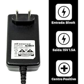 Quais as especificações do produto - input: bivolt 110 - 240v 50-60hz 0.33a - output: 15v - 1.5a positiva - plug: 6,0mm x 3.4mm ou 5.5mm x 2.5mm - comprimento do rabicho: 1,80 metros - cabo de força: acompanha - medidas da fonte: comprimento = 8,7 cm / largura = 4,8 cm / altura = 2,7 cm - cor: preto - atente-se também ao pino conector, ele deve ser igual ao utilizado no seu aparelho comprimento e largura .