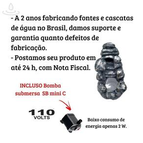 Jpfontes artesanaisMissão:1. Desenvolver produtos de qualidade, feitos com respeito e carinho para satisfação dos clientes.2. Trabalhar a favor do meio ambiente e da natureza, retirando dela produtos que levariam centenas de anos para degradação.4. Oferecer aos clientes a melhor opção de compras na internet.Leia a atentamente a descriçãoAs fontes cascatas de água jpfontes é um artesanato, ela tem iluminação de led embutida, que deixará sua decoração ainda mais diferenciada. Sem dizer que ela tem o controle remoto para você escolher as cores, intensidade das luzes e ritmo do pisca-pisca.Material: Ela é feita com uma massa exclusiva, que quando esculpida dá aquele toque de pedras material com qualidade e garantia da fábrica .Voltagem: bomba de água você pode optar por 110 vInclui1 fonte de água1 bomba de água regulávelDimensões:Comprimento: 30 cmLargura: 25 cmAltura: 32 cmA fonte d'água além de objeto de decoração, traz diversos benefícios para o ambiente, desde aumentar a umidade do ar, até eliminar energias negativas do ambiente fengshui . Sem dizer que você vai adorar o barulhinho da água em movimento que traz harmonia, calma e tranquilidade. Além disso pode servir como bebedouro para quem tem gatos em casa.Modo de usar: seu produto será encaminhado montado, bastando apenas colocar a água e ligar na tomada, simples assim.Garantias: Por ser um artesanato produto feito totalmente a mão , não garantimos peças idênticas quanto a formatos e tonalidade de cores.Qualquer dúvida fique à vontade para perguntar através do chat, nossa equipe de vendedores estará pronta para ajudar.Boas comprasFontedeágua fontedeagua fontedeaguademesa fontedemesa cascatadeagua fengshui fontes decorativas fonte de água fonte cascata fonte de agua fonte de agua para gatos fonte agua cascata fonte agua fonte de agua cascatas fonte para jardim cascata de agua fonte decorativa chafariz fonte cascata decorativa fontes roda dagua fonte de água para gatos fonte decorativa cascata fonte de agua feng shui fonte de água decorativa fonte de jardim mini fonte de agua fonte solar fontes decorativas grandes fonte de água cascata fonte cascata fonte de agua decorativa fontes de água fonte jardim fonte buda fonte agua decorativa Marca: Jpfontes Artesanais