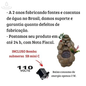 Marca: jpfontes Material: massa exclusiva jpfontes, que quando esculpida dá aquele toque de pedra, com qualidade e garantia de fábrica. Voltagem: luzes bivolt / bomba d'água 110 v.