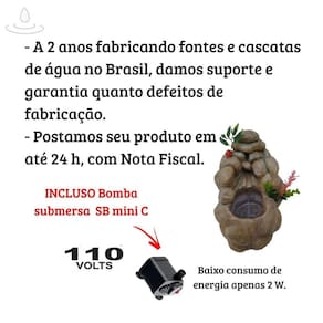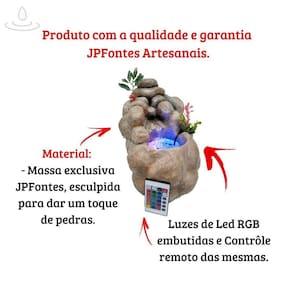 Jpfontes artesanais, missão: 1. Desenvolver produtos de qualidade, feitos com respeito e carinho para satisfação dos clientes. 2. Trabalhar a favor do meio ambiente e da natureza, retirando dela produtos que levariam centenas de anos para degradação. 4. Oferecer aos clientes a melhor opção de compras na internet. Leia a atentamente a descrição Nossa fonte cascata é uma artesanato e conta com iluminação embutida de led, deixando sua decoração ainda mais diferenciada. Sem dizer que com o controle remoto você pode ter o controle total das luzes alternando cores, intensidade e ritmo do pisca-pisca. Marca: jpfontes Material: massa exclusiva jpfontes, que quando esculpida dá aquele toque de pedra, com qualidade e de fábrica. Voltagem: luzes bivolt / bomba d'água 110 v. Inclui: 1 fonte de água 1 bomba de água regulável 1 sistema de iluminação de led com controle remoto Medidas do produto anunciado: Comprimento: 30 cm Largura: 23 cm Altura: 25 cm A fonte d'água além de objeto de decoração, traz diversos benefícios para o ambiente, desde aumentar a umidade do ar, até eliminar energias negativas do ambiente fengshui . Sem dizer que você vai adorar o barulhinho da água em movimento que traz harmonia, calma e tranquilidade. Além de servir como bebedouro para quem tem gatos em casa. Modo de usar: Seu produto será encaminhado montado, bastando apenas colocar a água e ligar na tomada, simples assim. Garantias: Por ser um artesanato produto feito totalmente a mão , não garantimos peças idênticas quanto a formatos e tonalidade de cores. Qualquer dúvida fique a vontade para perguntar através do chat, nossa equipe de vendedores estará pronta para ajudar. Boas compras Fontedeágua, fontedeagua, fontedeaguademesa, fontedemesa, cascatadeagua, fengshui Marca: Não Informado