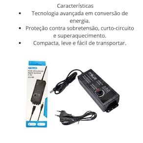 BenefíciosVersatilidade: Compatível com uma ampla variedade de dispositivos e aplicações.Proteção Avançada: Sistema que evita danos causados por sobretensão, curtos e aquecimento excessivo.Alta Eficiência: Conversão energética que melhora o desempenho e prolonga a vida útil.Compacta e Portátil: Design leve e funcional, ideal para transporte e uso diário.CaracterísticasTecnologia de conversão de energia de última geração.Compacta, leve e fácil de manusear.Proteção integrada contra curto-circuito, sobretensão e superaquecimento.Especificações TécnicasMarca/Modelo: It-Blue LE-0185Tensão de Entrada: AC 100V-240V (50-60Hz)Tensão de Saída: Ajustável de 3V a 24VCorrente Máxima: 3ADimensões: 14 cm x 5 cm x 3 cm (C x L x A)Proteções: Contra curto-circuito, sobretensão e aquecimento.Detalhes do ProdutoIdeal para aplicações em monitoramento, banda larga e equipamentos de informática.Design ergonômico, projetado para fácil ajuste e uso.Alta confiabilidade, fabricada com componentes de alta qualidade.Conteúdo da Embalagem1 Fonte de Alimentação Digital Ajustável LE-0185.Manual de instruções detalhado.