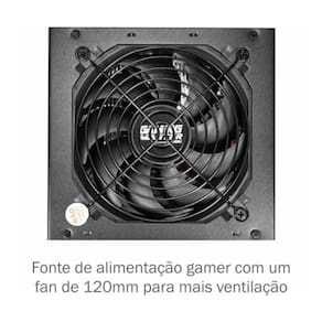 o ; Potência real de 500Wo ; Certificação 80 Plus para maior eficiênciao ; PFC ativo para estabilidade e segurança elétricao ; Fan 120mm silencioso e de alto desempenhoo ; Compatível com o padrão ATX 12V 2.31o ; Ideal para gamers e PCs de alto desempenho