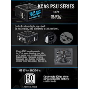 Fonte Gamer ATX Aerocool KCAS 400W 80 Plus Full Range APFC Modelo: KCAS 400W A Fonte Gamer ATX Aerocool KCAS 400W é a escolha ideal para iniciantes. Fazendo parte da linha KCAS, esse modelo conta com certificação 80 Plus White e PFC Ativo, garantindo eficiência energética e estabilidade. Já sua configuração full range atende às necessidades básicas de energia para seu setup gamer, proporcionando confiabilidade e desempenho a um preço acessível. Características: - Dimensões: 150 x 86 x 140mm - Peso: 1.7Kg - Potência: 400W - Pinos: 1x Placa-mãe 20+4/ 1x VGA 6+2/ 1x CPU 4+4/ 1x PCIe/6x Sata/ 3x Pata/ 1x FDD - Tensão Entrada: 115~230VAC 6-3A 47~63Hz - Tensão Saída: +3.3V/+5V/+12V/-12V/5VSB - Corrente: 20A/20A/30A/0.4A/2.5A - Ventiladores: 12cm Informação adicional: - Compatível com ATX12V Ver.2.3 - Até 80% + eficiência com certificado oficial White 80Plus - Comprimento do cabo de 20 + 4P e CPU 4 + 4P até 550 mm - fácil alcance para todos os componentes - Fan de 12 cm super silencioso com controle inteligente de velocidade - Proteções completas com OVP / UVP / OPP / SCP / SIP - Segurança e EMC certificada pela CE e TUV - ECO amigável com as diretivas RoHS e Erp 2013 - Compatível com ATX12V - PFC Ativo - Certificado 80 Plus garantindo 80% da eficiência da fonte - Proteção: OVP / UVP / OPP / SCP / SIP - Full Range (Bivolt Automática)
