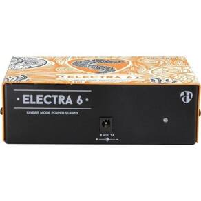 Fonte Linear Hayonik Para 6 Pedais De Efeito Electra 6 9vdc 1000ma A fonte Electra 6 opera de forma automática qualquer tensão da rede elétrica entre 100 e 240Vac. Ela possui capacidade de suprir energia para até 6 pedais. Por ser uma fonte linear a Electra 6 não produz interferências de ondas de rádio frequência.