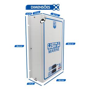 Construído para resistir às condições severas do ambiente marítimo, sua placa de circuito impresso em fibra de vidro é protegida por banho de verniz isolante, aumentando a resistência contra umidade e corrosão. Além disso, o gabinete em alumínio com pintura eletrostática epóxi garante robustez, proteção e longa vida útil ao equipamento.