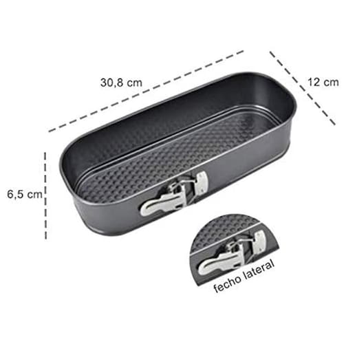 Forma Antiaderente com Fecho Lateral 30,8x12x6,5cm - Catuaí Forma Antiaderente retangular com cantos arredondados.Possui fecho lateral e removível, é ideal para assar bolos e tortas.Assadeira com camada antiaderente de teflon não gruda e fácil de limpar. Dimensões Comp x Larg x Alt : 30,8 x 12 x 6,5 cm Marca: Não Informado