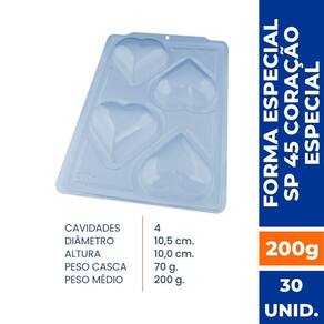 Forma especial com silicone (3 partes), ideal para produção de chocolates com muito mais praticidade e precisão. Possui uma “marquinha” indicando a quantidade necessária de chocolate, levando para geladeira uma única vez. Ela proporciona uma casca uniforme e um acabamento perfeito sempre com o mesmo peso. Abaixo mais informações do produto.