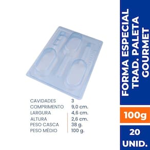 Quantidade: 01 Cavidade: 3 Comprimento: 90 mm x Largura: 46mm x Altura: 26 Peso casca: 38 g Peso médio: 100 g Modelo: Especial (3 Partes)