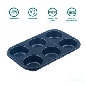Fabricada em aco carbono de 0,5mm, oferece alta durabilidade e excelente conducao de calor, garantindo muffins dourados por igual e assados no ponto certo.