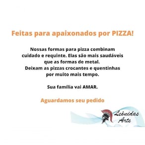 FORMAS DE PIZZA DE PEDRA SABÃOQue tal reunir a família e amigos para compartilhar bons momentos acompanhados de deliciosas pizzas!?Estudos científicos mostram que cozinhar em Formas assadeiras de Pedra Sabão é benéfico para a saúde, ao contrário das assadeiras de metal que estão associadas aos maus de Parkinson e Alzheimer.As formas de Pedra Sabão vão deixar suas pizzas ainda mais gostosas. Elas propagam o calor de forma uniforme e eficiente, assam a pizza por igual e as mantem quente por mais tempo, mesmo após retirar do forno.Duráveis e decorativas as bandejas de Pedra Sabão levam charme e requinte para sua cozinha e mesa.Leve o sabor da comida mineira para sua casa!PARA USO EM FORNOS! Não deve ser usada na chama direta.Medidas:- Diâmetro externo: 42 cm- Diâmetro interno: 40 cm- Alça a alça: 50 cm- Peso: 5 kgMatéria prima- Pedra Sabão e Cobre