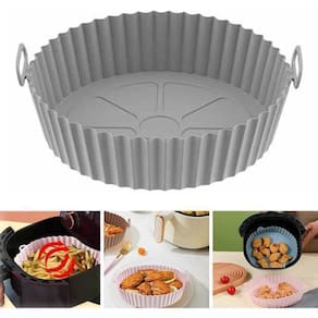 Especificações: Tamanho aproximado: 4,5x18cm de Peso aproximado: 60g Tipo de produto: forma redonda com alca para air fryer / fritadeira eletrica Cor: cinza e vermelho Composição: silicone Ean: 7899850349888