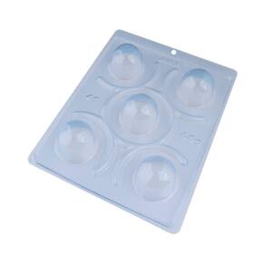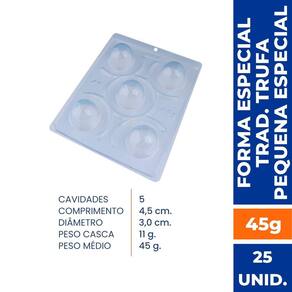 Forma especial com silicone (3 partes), ideal para produção de chocolates com muito mais praticidade e precisão. Possui uma “marquinha” indicando a quantidade necessária de chocolate, levando para geladeira uma única vez. Ela proporciona uma casca uniforme e um acabamento perfeito sempre com o mesmo peso. Abaixo mais informações do produto._x005F_x005F_x005F_x000D_ Cavidades: 5 Diâm.: 45 mm x Alt.: 30 mm Peso casca: 11 g Peso médio: 45 g