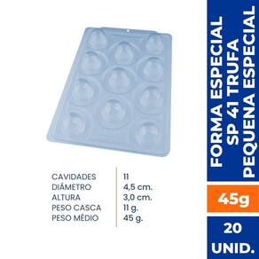 Forma especial com silicone (3 partes), ideal para produção de chocolates com muito mais praticidade e precisão. Possui uma “marquinha” indicando a quantidade necessária de chocolate, levando para geladeira uma única vez. Ela proporciona uma casca uniforme e um acabamento perfeito sempre com o mesmo peso. Abaixo mais informações do produto.