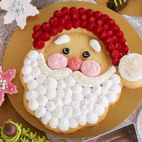 Forma de alumínio modelo papai noel. Possui partes do miolo rebaixado, que proporciona o desenho perfeito de rosto. Este modelo é perfeito para fazer bolos natalinos.