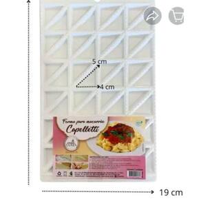 Forma em polímero livre de BPA para capelletti disponível somente na cor branca Faz até 48 capellettis por vez Comprimento da forma 33 cm e largura de 17,5 cm Tamanho do capelletti 5 x 4 cm de comprimento Modo de usar:coloque uma camada de massa pronta sobre a forma,coloque o recheio do seu gosto e cubra com mais uma camada de massa, passe o rolo e está pronto seu delicioso capelletti