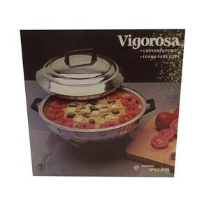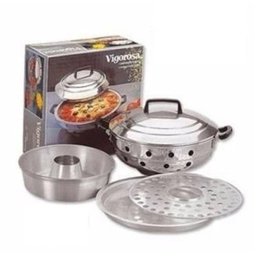 Essa incrível forma Vigorosa vai facilitar a sua vida muito mais do que imagina. Ótima no preparo de bolos, pudins, churrasco, pizza, grelhados reduzindo bastante o uso de gás. Ideal para uma alimentação balanceada e saudável. Essa forma multiuso é a queridinha da cozinha, uma vez que ela: assa pizzas, faz bolos, grelha diversos tipos de carne e faz até churrasco. Torna-se um produto de grande utilidade em sua cozinha, sendo um coringa para qualquer preparo. Formas de usar: Para grelhados - (churrasco, pescado, etc): Coloque a base com o seu orifício central sobre o queimador do fogão. Em seguida introduza a grelha com a aba para cima e sobre a mesma espalhe o alimento que será grelhado. Acenda a chama do fogão e ajuste a tampa. Não será necessário virar o alimento, pois a peça foi projetada especialmente para que haja circulação do calor por igual em seu interior. Tempo máximo para assar é de 8 a 12minutos em fogo normal. Para Bolos: Coloque a base com o seu orifício central sobre o queimador do fogão e em seguida coloque sobre a mesma a forma já com a massa do bolo. Acenda a chama do fogão e ajuste a tampa sobre a forma de bolo. Tempo máximo para assar é de 37 minutos em fogo baixo. Para Pizzas: Coloque a base com o seu orifício central sobre o queimador do fogão e em seguida introduza a forma. Coloque a massa da pizza e seus condimentos dentro da forma. Acenda a chama do fogão e ajuste a tampa sobre a forma. Tempo máximo para assar é de 5 a 8 minutos em fogo baixo. Regimes e Dietas: A forma Vigorosa é também utilizada para cozimentos sem gorduras ou óleos, deixando os alimentos com sabor natural e mais saudável. Especificações: Dimensões (LxAxP) 32,5cm x 13,5cm x 32,5cm Peso 1,522kg