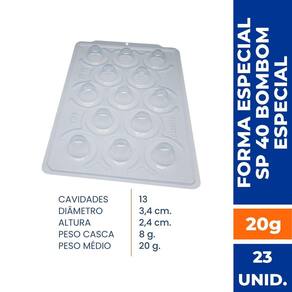 Quantidade: 01 Cavidades: 13 Diâmetro: 34 mm x Altura: 24 mm Peso Casca: 8 g Peso Médio: 20 g