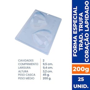 Quantidade: 01 Cavidades: 2 Comprimento: 95 mm x Largura: 94 mm x Altura: 32 mm Peso casca: 45 g Peso médio: 200 g Modelo: Especial (3 Partes)