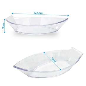 Kit C/5 Forminha Barco Canapé Festa Casamento Evento 100 Ml, perfeito para adicionar sofisticação à apresentação de canapés e maionese em eventos especiais. As barcas de acrílico realçam a beleza dos canapés, proporcionando uma exibição impressionante. São versáteis e ideais para canapés, maionese, aperitivos e molhos. Com altura de 3 cm, largura de 7 cm e comprimento de 12,5 cm, cada barca tem capacidade para 100 ml. Adquira o kit e transforme seus eventos em momentos inesquecíveis. Ean: 7899659397776