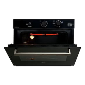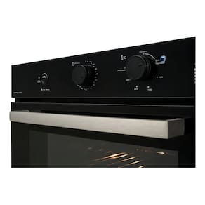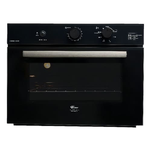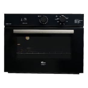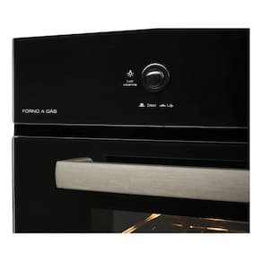 Forno de embutir a gás com grill dourador, timer sonoro e controle de temperatura de 160°C a 260°C. Revestimento interno EasyClean, porta com vidro duplo e sistema de resfriamento interno.Timer