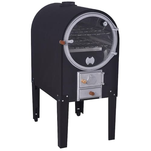 Forno a lenha com acabamento interno em aço inoxidável e pintura externa em tinta especial para alta temperatura. Porta com visor em vidro temperado. Possui termômetro, câmara e bandeja em aço inoxidável, e duas grades em diferentes alturas. Pés desmontáveis, 2 puxadores frontais e 2 rodinhas.Número de bocas