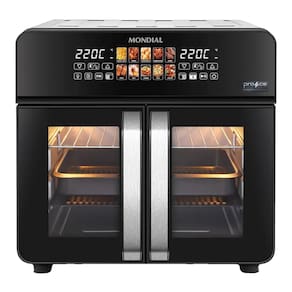 Especificações: - Modelo: AFDO-25L-FD - Dimensões do produto: 39,5cm x 40cm x 40cm (AxLxP) - Cor: Preto / Inox - Capacidade: 25L - Potência: 2000W (127V) / 2200W (220V) - Temperatura: Até 200ºC - Timer: 90 minutos - Ação do produto: Assa, grelha e frita sem óleo com ar quente. Possui Dualzone para duas receitas ao mesmo tempo e função sincronizar para deixá-las prontas juntas. - Revestimento antiaderente: Sim - Segurança: Vidro duplo, French Door, desligamento automático, alarme sonoro, painel touch, luz interna, divisória segura, pés antiderrapantes. - Luz indicadora: Sim