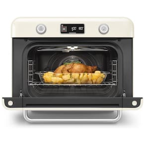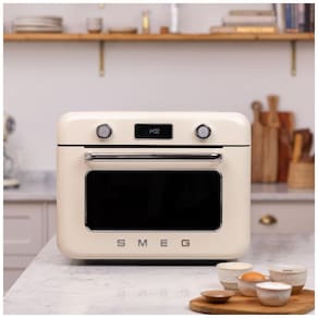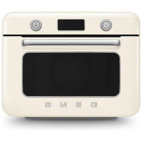 O forno combinado de bancada retrô Smeg COF01 na cor creme é um equipamento multifuncional para uso doméstico, que reúne funções de assar, gratinar, convecção, vapor e air fry em um único aparelho compacto. Possui cavidade com capacidade aproximada de 30 L, adequada para preparo de assados, legumes, pães e diversas receitas em cozinhas com espaço limitado.