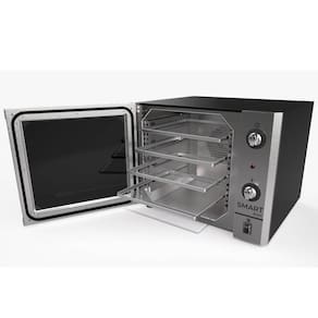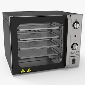 Ideal para cafés, bistrôs, bares, etc; Indicado para doces, bolos, salgados, pizzas e massas; Acabamento interno em aço inoxidável; Acabamento externo em aço carbono com pintura a pó eletrostática em aço inoxidável; Isolamento térmico em lã de rocha; Acompanha 4 esteiras de 35x35 cm, confeccionadas em alumínio perfurado; Equipado com termostato que permite controle de temperatura até 250c, com sistema de segurança que desliga a resistência se houver superaquecimento; Temporizador de até 120 minutos; Possui sistema de ar forçado, responsável por assar uniformemente os alimentos, maximizar a eficiência para economia de energia; Perfil de vedação da porta em silicone, que proporciona eficiente vedação e é de fácil substituição; Puxador em aço inoxidável 430, com baixa condutividade térmica, que torna prático e seguro o manuseio.Timer