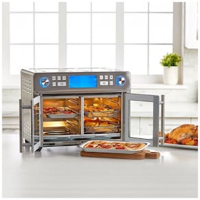 Descubra o Forno de Convecção e Fritadeira Emeril Lagasse French Door 360, o versátil eletrodoméstico que eleva praticamente qualquer refeição, desde petiscos rápidos fritos no ar até assados para grandes encontros. Inclui um acessório de pedra de pizza para resultados crocantes estilo restaurante. Com 24 configurações de cozimento para uma variedade de métodos de preparo: Costelas, Descongelar, Assar, Tostar, Frango, Pizza, Pastelaria, Cozimento Lento, Assar, Reaquecer e Manter Aquecido. Ventilador de Dupla Velocidade para uma fritura dourada perfeita com circulação de ar aquecido a 360 graus. Com presets de cozimento para fritar, torrar, rotisserie, assar, grelhar, cozinhar lento, desidratar e muito mais. Este não é apenas um forno elétrico. É um combo de fritadeira e forno de convecção de porta francesa, combinando 10 utensílios de cozinha em um só. Com zonas personalizadas e presets duplos, garante que cada prato seja uma obra-prima. Com a tecnologia QuickSync, sincronize tempos de cozimento e configurações entre as zonas para que cada parte da sua refeição termine simultaneamente, garantindo porções frescas e quentes. Com espaço generoso e capacidade grande de 23,66 litros, alimente sua família ou festa! Inclui uma pedra de pizza para resultados crocantes. Acelere seus pratos culinários em até 60, tornando as festas mais rápidas. Com o forno de convecção e fritadeira Emeril Lagasse, vá de alimentos congelados a pratos tentadores em minutos. Imagine transformar camarões congelados em scampi saborosos em apenas 10 minutos, sem descongelamento prévio.