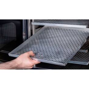 Possui 5 assadeiras de tamanho 35 x 35 cm, em alumínio perfurado, permitindo uma maior produtividade por fornada.