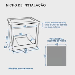 Forno de embutir a gás com capacidade de 50L, acendimento automático, revestimento Easy Clean, temperatura ajustável de 180°C a 290°C, função grill, timer grill e porta com vidro panorâmico espelhado.Timer