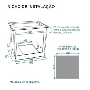 Forno de embutir a gás com capacidade de 50 litros, ideal para cozinhas planejadas. Possui duas prateleiras deslizantes, função grill com timer e porta com vidro panorâmico e vidro duplo para melhor isolamento térmico.Timer