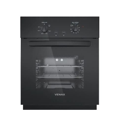 Forno de embutir à gás com capacidade de 51,8L, função grill, acendimento automático, timer de 120 minutos e 5 posições de temperatura (180°C a 290°C).Timer
