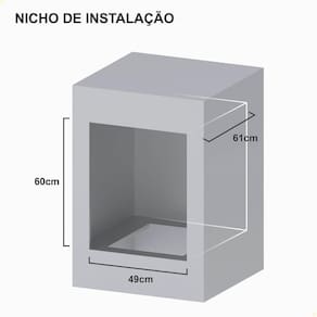 As dimensões externas são 61,5 cm (C) x 51,7 cm (L) x 61 cm (A) e as internas 37,8 cm (L) x 47 cm (P) x 29 cm (A). O forno pesa 19 kg.