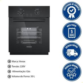 - O Forno de Embutir a Gás Venax Totale Nero 50L é a escolha ideal para quem busca praticidade e eficiência com design moderno.