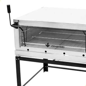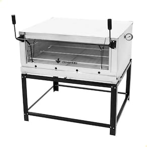 DESCRIÇÃO - Laterais, frente e teto externas em aço inox; - Sistema para abertura do vidro tipo guilhotina com acabamento em pintura a pó eletrostática com base fosfatizada; - Queimadores com sistema de gaveta, em aço tubular, com regulador de entrada de ar para uma chama perfeita; - Pedra refratária que armazena o calor obtendo maior; - Uniformidade no assado; - Bandeja coletora de resíduos em chapa galvanizada super resistente; - Acompanha uma grelha reforçada por câmara; - Cavalete reforçado em aço carbono com acabamento em pintura a pó eletrostática com base fosfatizada; - Revestimento interno em aço galvanizado; - Câmara com três trilhos de apoio para regulagem de altura das grelhas; - Isolamento em lã de rocha; - Abertura total do vidro; - Termômetro na lateral do forno;