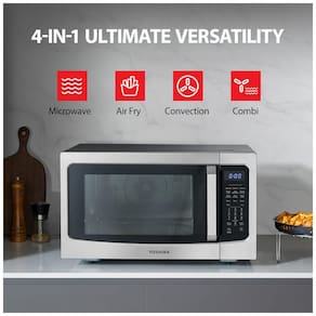 Forno de Micro-ondas Toshiba Air Fryer Combo 4 em 1, 42,5 litros, 1000 watts, acabamento em aço inoxidável, função de fritura saudável com 10 menus automáticos, função de convecção com 4 menus automáticos de assar e 4 de assar, função sensorial com 13 menus automáticos, descongelamento fácil por peso/tempo, cozimento de micro-ondas com 10 níveis de potência, função de manter aquecido, botões de cozimento expresso, função de memória, luz LED, prato giratório de vidro, modo eco, botão de silenciar, relógio e timer de cozinha. Interior em aço inoxidável resistente a arranhões e ferrugem, fácil de limpar. Combo 4 em 1 com funções de micro-ondas, fritadeira a ar, convecção e combinação de cozimento. Prato giratório removível acomoda um frango inteiro ou pizza.Função Grill