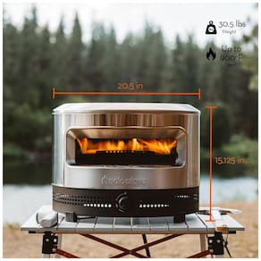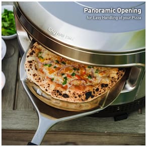 Forno de pizza a gás portátil com aquecimento potente em aço inoxidável e pedra de pizza. Pré-aquece em 15 minutos e prepara pizza em 90 segundos. Controle de temperatura frontal. Abertura panorâmica de boca larga. Pedra de pizza de cordierita incluída. Construído em aço inoxidável 304 durável.Forno autolimpante