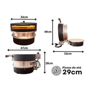 Forno linha comercial elétrico para pizza de até 29cm Temperatura de operação até 400C Com o PizzeHome P300 Standard você assa de pizzas clássicas italianas até as brasileiras de bordas altas com até 29cm em até 180 segundos. A temperatura interna do forno chega em 400C em apenas 30 minutos. O controle de temperatura é feito através de termostato eletromecânico, basta escolher a temperatura no botão seletor que o forno irá ajustar automaticamente. Simples, prático e completo Controle de temperatura e pedra refratária cordierita a mesma pedra Utilizado nos fornos a lenha das pizzarias para manter a temperatura constante e assar a suas pizzas com sucesso Não precisa fornear ou girar a sua pizza, basta fechar a tampa e depois de 90 segundos retirar a pizza. Versatilidade Além de pizzas incríveis, também é possível fazer calzones, esfirras, crostatas, bruschetta. Abuse da criatividade Características técnicas Dados elétricos: 1.500W / 220V / 6,85A / 50/60Hz - Tomada 2P + T 10A Pedra refratária em cordierita com diâmetro de 310mm e 11mm de espessura Material: Alumínio com pintura eletrostática preta, revestido com fibra cerâmica, resistência elétrica. Temperatura máxima de operação: 400C Tamanho máximo da pizza diâmetro: 29cm 290mm Dimensões sem embalagem: altura 28cm x largura 38cm x comprimento 38cm Dimensões com embalagem: altura 30cm x largura 35cm x comprimento 35cm Peso sem embalagem: 4,9kg Peso com embalagem: 5,5kg Marca: BrewBeer Indústria e Comércio de Equipamentos Origem: Brasil
